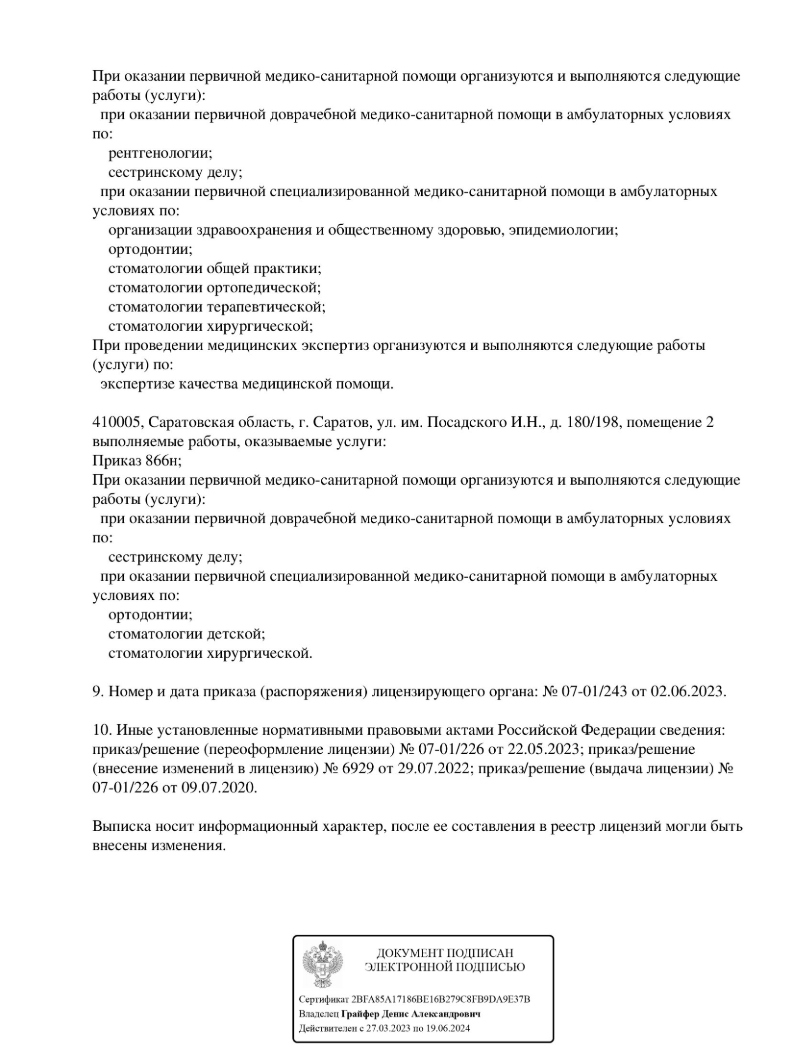 Проводит консультации, лечение кариеса, отбеливание зубов, профессиональную гигиену, лечение дёсен, реставрацию зубов, лечение каналов зубов, лечение под закисью азота, лечение под седацией, рентгенологию и КТ.